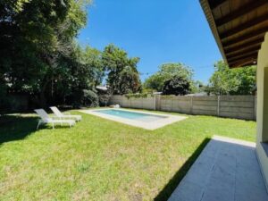 la propiedad se destaca por su amplio espacio de jardín, sus arboles añejos que tienen suficiente tamaño para ofrecer excelente sombra para quienes no quieren disfrutar del sol, hay lugar para todos los gustos. Con una piscina de 8 x 4 metros, revestida, a la cual le llega el sol durante toda la tarde. Espacio para fogonero y juego de mesa y sillas de jardin.