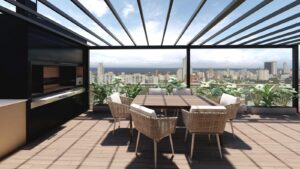 Una terraza social con parrilla y un comedor al aire libre, independiente del salón de usos múltiples cubierto13;