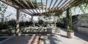 La terraza está ambientada como espacio "verde", con plantas, piscina y solárium13;