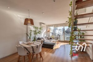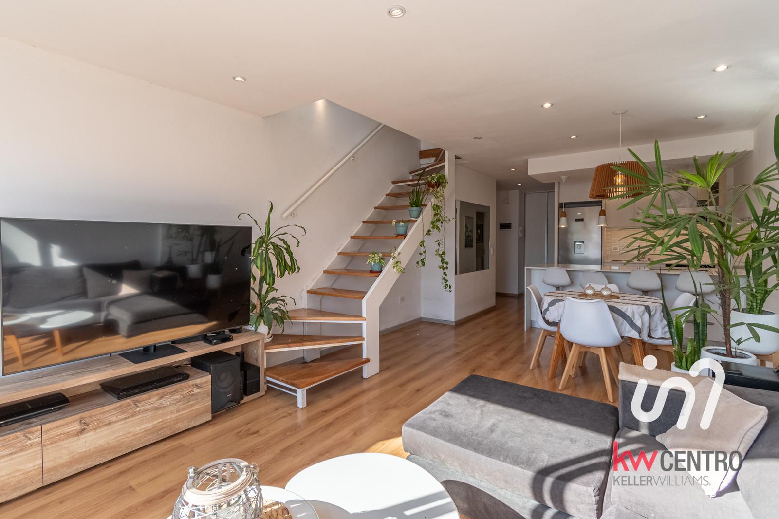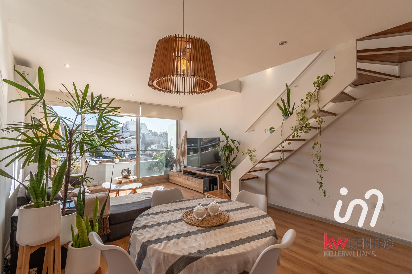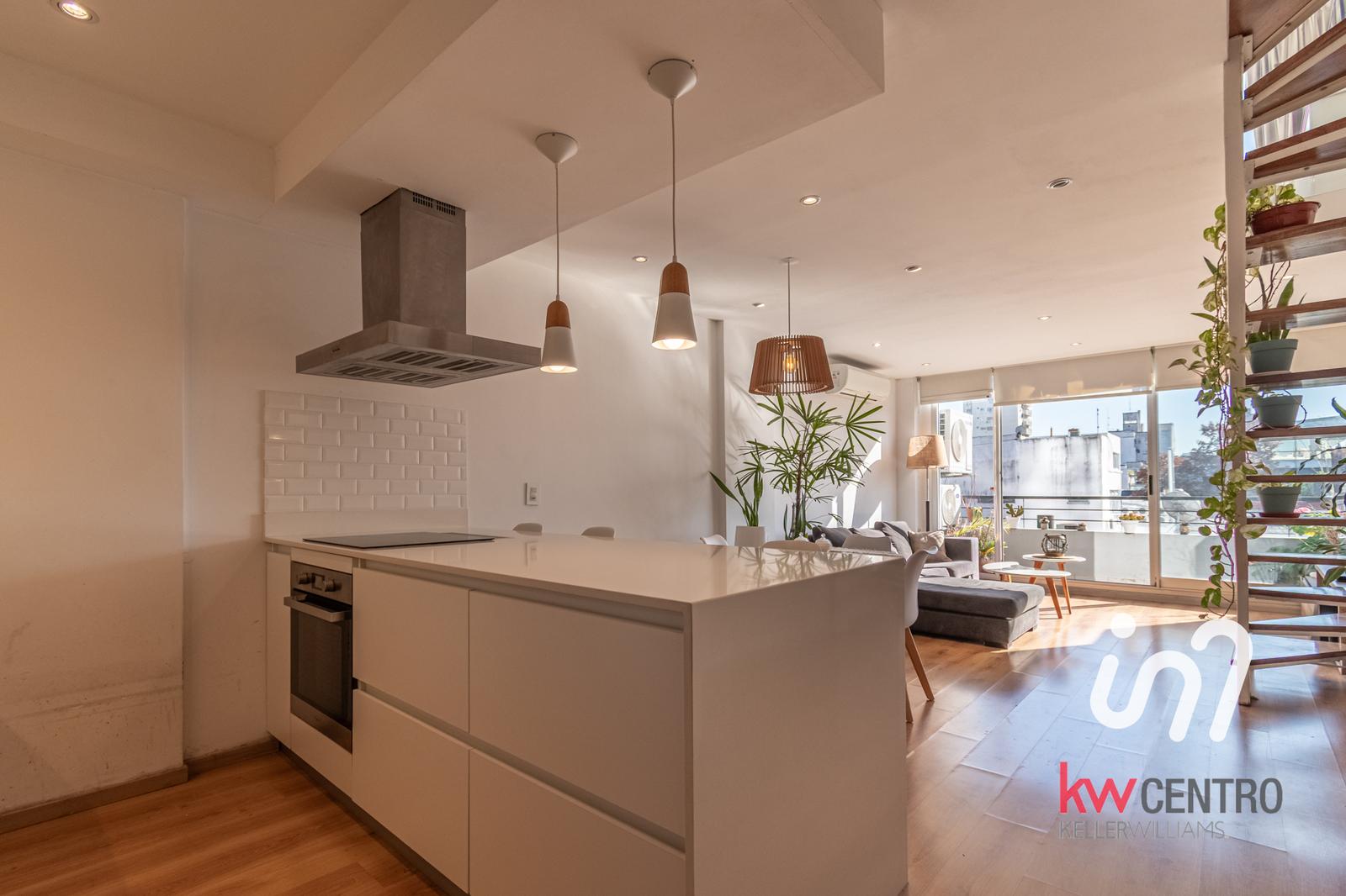 Luminoso y amplio duplex dos ambientes en el corazón de Palermo Hollywood. Se trata de un segundo piso con altura de un 4to piso. Se ingresa a un amplio living comedor con cocina incorporada. Cocina con mesada de silestone, muebles de calidad, hornalla en la isla, todo eléctrico. En planta baja tambien un baño completo, un placard con espacio para lavarropas y un balcón con orientación norte.